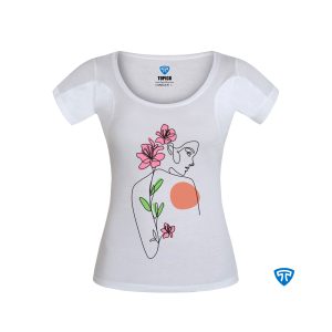 تیشرت ضدتعریق زنانه سفید طرح چهره و گلبرگ