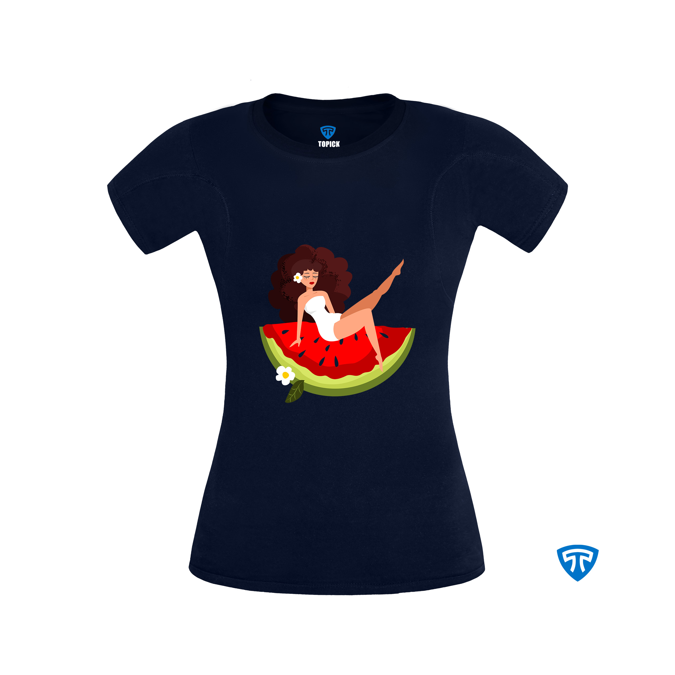 تیشرت ضدتعریق زنانه سورمه ای طرح دختر نشسته مو فرفری