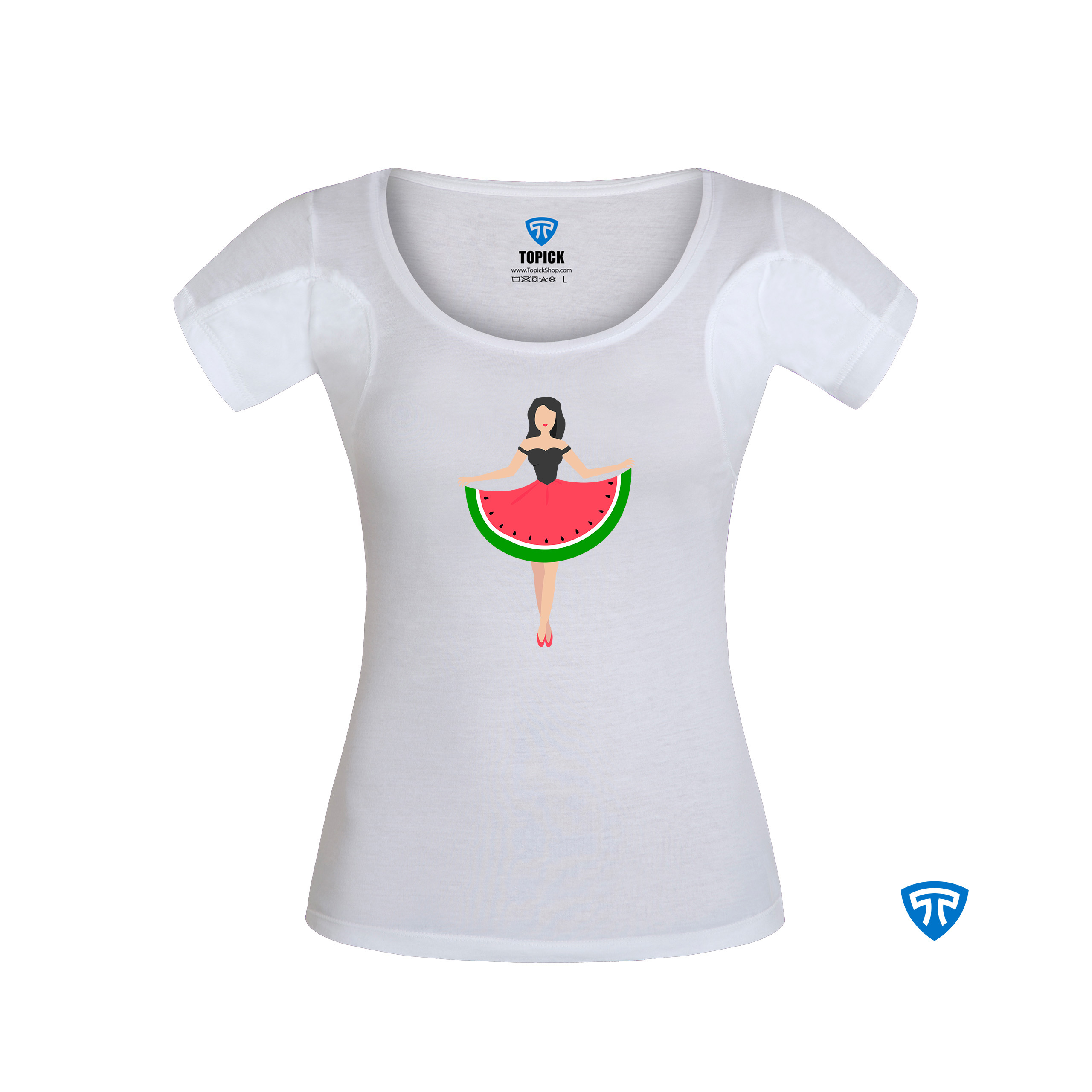 تیشرت ضدتعریق زنانه سفید طرح دختر دامن هندونه ای (تاپ مشکی)