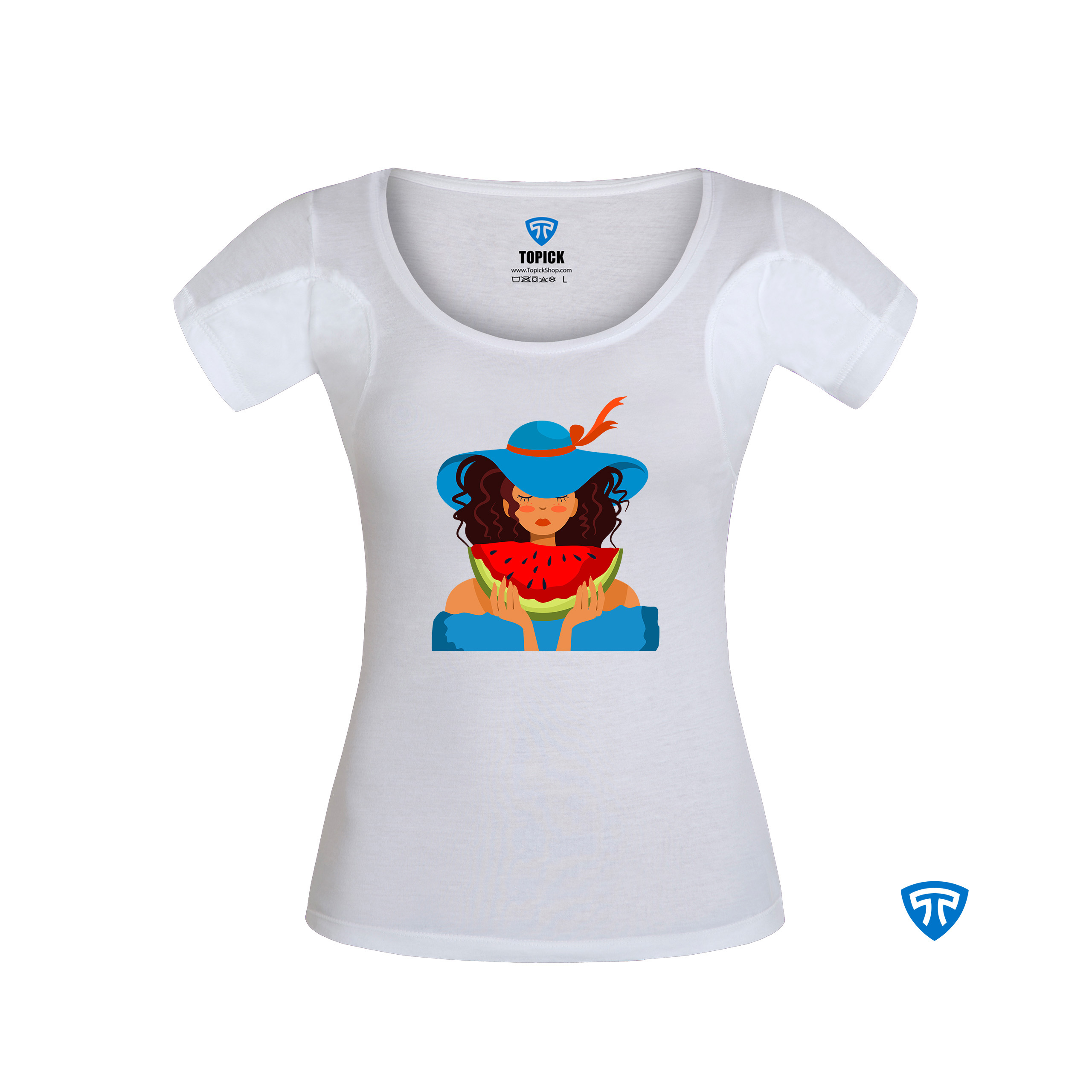 تیشرت ضدتعریق زنانه سفید طرح دختر کلاه آبی
