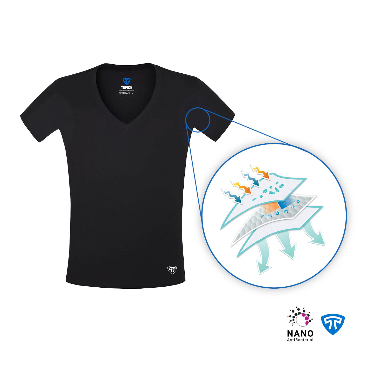 زیرپوش ضد تعریق نانو آنتیباکتریال تاپیک دارای سه لایه پارچه در ناحیه زیربغل است که با ظرافت زیادی دوخته شدهاند. لایه میانی نقش اساسی را ایفا میکند. این لایه از پارچهای دوطرفه تشکیل شده است که یک طرف آن خاصیت آبدوستی دارد و تعریق را از روی بدن جذب میکند؛ در حالی که طرف دیگر خاصیت آبگریزی دارد و مانع از عبور عرق به ناحیه زیربغل میشود. این قابلیت به همراه عبور هوا، امکان تهویه مناسب را در طول روز فراهم میکند. شما میتوانید به صورت روزانه از زیرپوش تاپیک استفاده کنید.