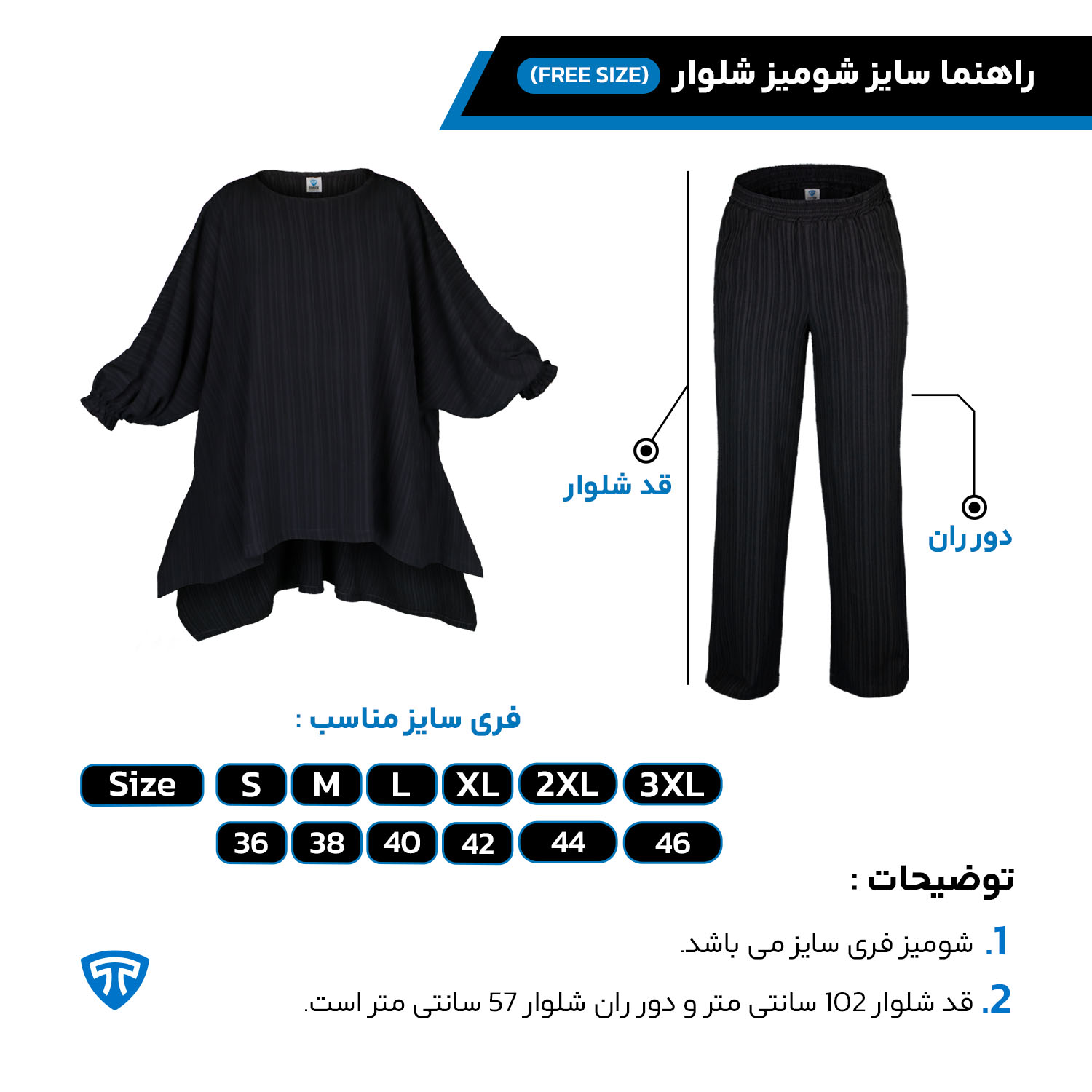 این ست به گونهای طراحی شده است که برای طیف گستردهای از اندازهها مناسب باشد، از سایز 36 تا 48، و به همه شکلها و اندازهها به خوبی مینشیند.