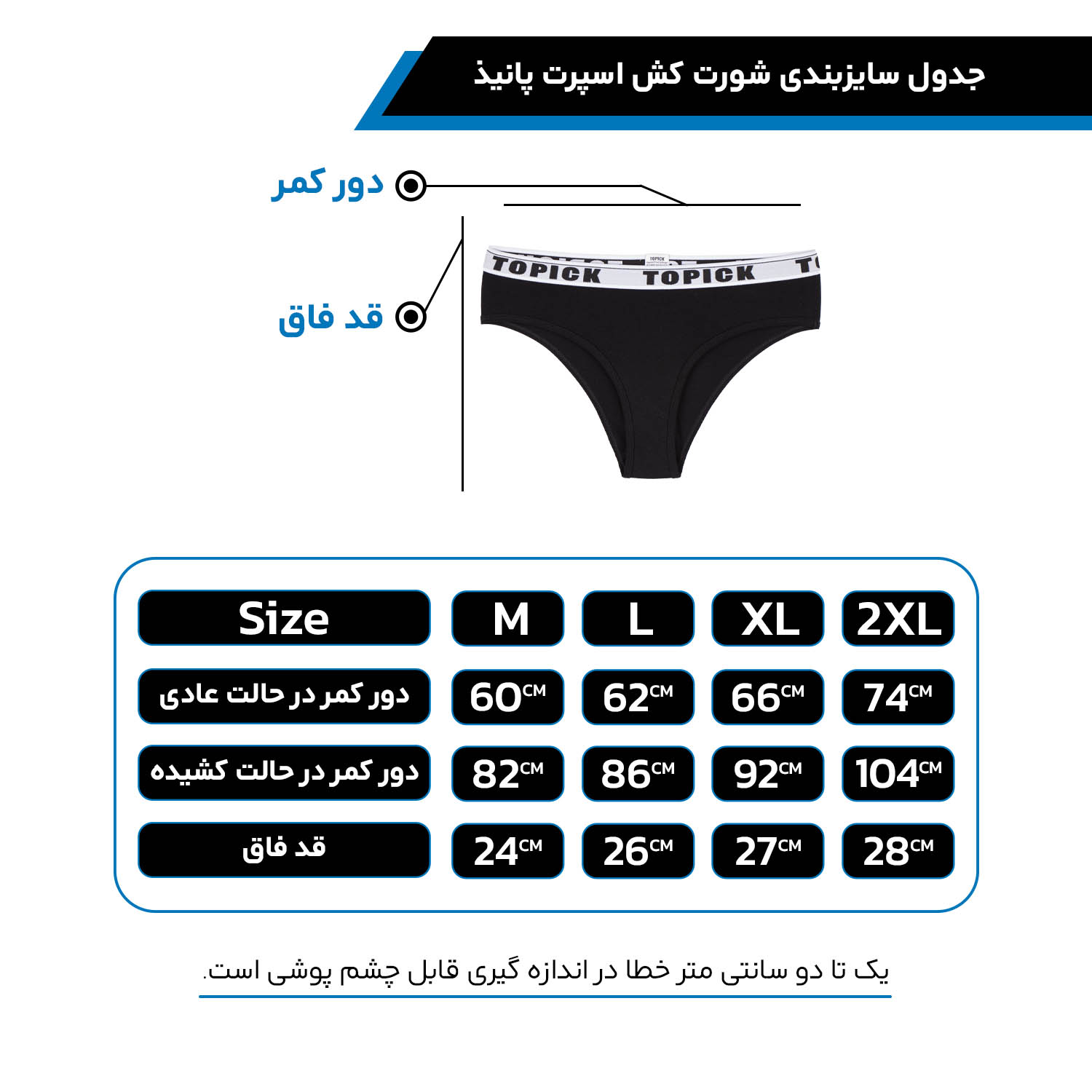 معیار سایز بندی شورت ضدحساسیت زنانه تاپیک، اندازه دور باسن و دور کمر است.